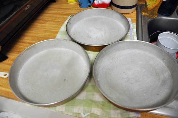 Tan adelante y aceite y harina de sus cacerolas. Asegúrese de que invierta sus cacerolas y bang en el borde del fregadero para bajar el exceso de harina. Entonces, les ponga a un lado hasta más tarde.
