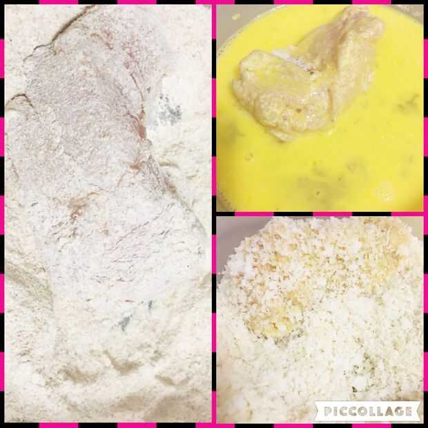 Lo primero que va hacer es sumergir el pollo en la harina y lo de la capa. Sacudir el exceso y luego se hunden en la mezcla de huevo y capa. Sacudir el huevo sobrante y luego transfiera el pollo a la mezcla de panko coco. Es molesto y un poco lentos, pero todos estos pasos le dan una fantástica capa crujiente que se queda en el pollo y no se cae al freír.
