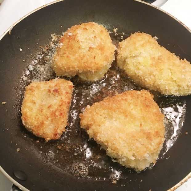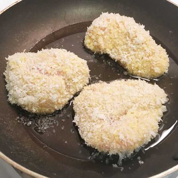 Añadir aproximadamente 1/4-1/2 taza de aceite de coco en una sartén y cocine a fuego medio. Desea cocinar su pollo recubierto en ambos lados de 1 a 3 minutos. Utilice su juicio. Desea que ambos lados se doren, pero no quemado. Retirar del aceite y poner sobre una placa para horno.
