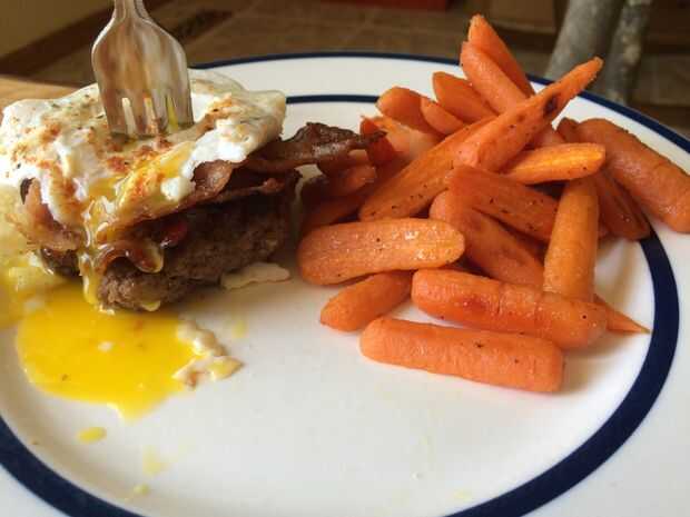 La pila te ternera con bacon y un huevo y empezar comiendo!