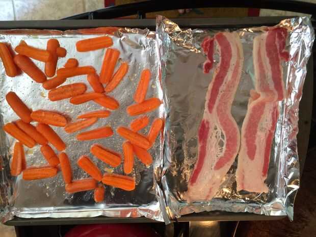 Coloque papel de aluminio en dos secciones separadas en una bandeja de hoja como se muestra. Coloque la zanahoria y el tocino en la hoja y coloque el trey de la hoja en el horno a 350 grados durante 17-20 minutos. (Dependiendo del grosor de la zanahoria y el tocino)