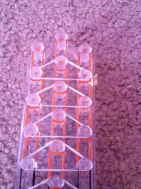 Paso 1: Comenzar la pulsera Primero usted tiene que asegurarse de que las flechas de su telar son hacia arriba y poner las bandas en el lado derecho hacia arriba y hacerlo hasta que la izquierda derecha y centro se llenan de bandas. Pero no las clavi