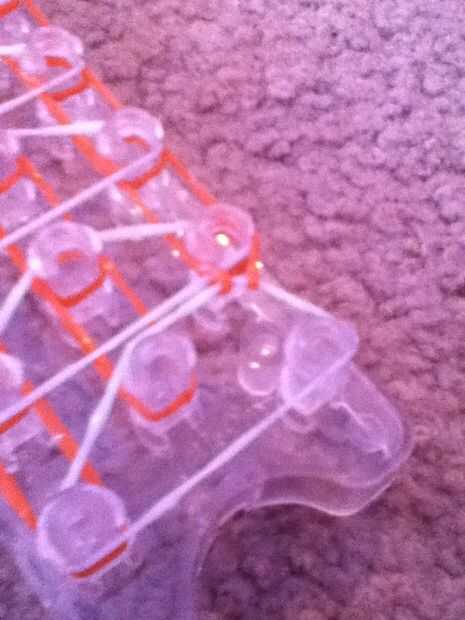Time to use your hook! En la parte inferior de su telar tome su anzuelo y tire hacia atrás el triángulo. Agarrar la otra banda y ponerlo en la clavija delante de ella. Hacerlo en los tres lados. Si no se ve como la prueba de imagen una vez más porque la práctica hace la perfección! : D