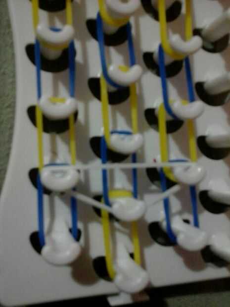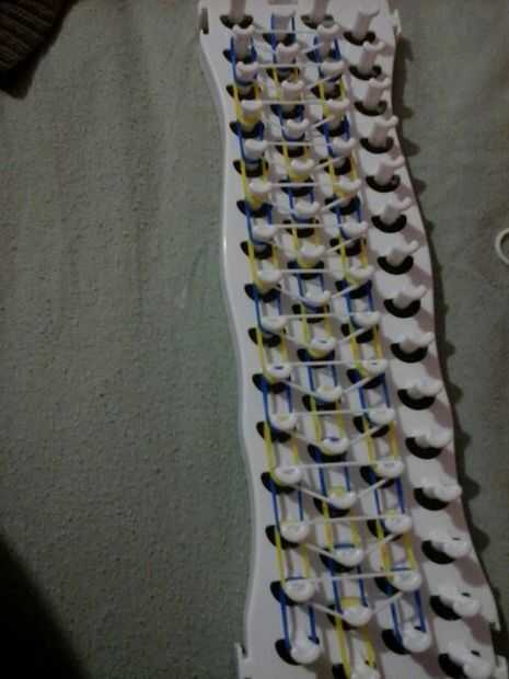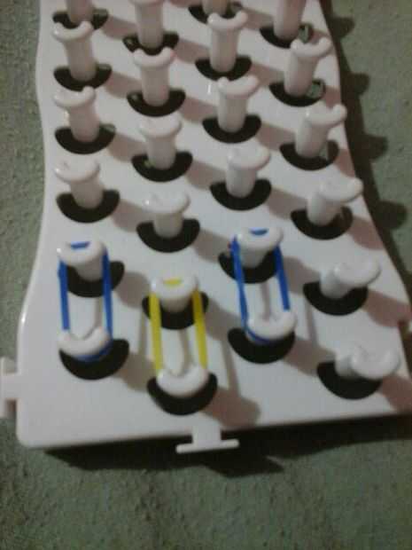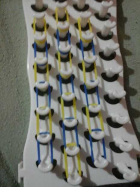 enseñará usted cómo hacer un triple soloPaso 1: Lo que necesitará Necesita...• un telar• un gancho negra• elásticosPaso 2: Colocación de banda Poner bandas en cada pin va hacia arriba como en la imagenContinuar hasta llegar a la parte superiorPaso 3: