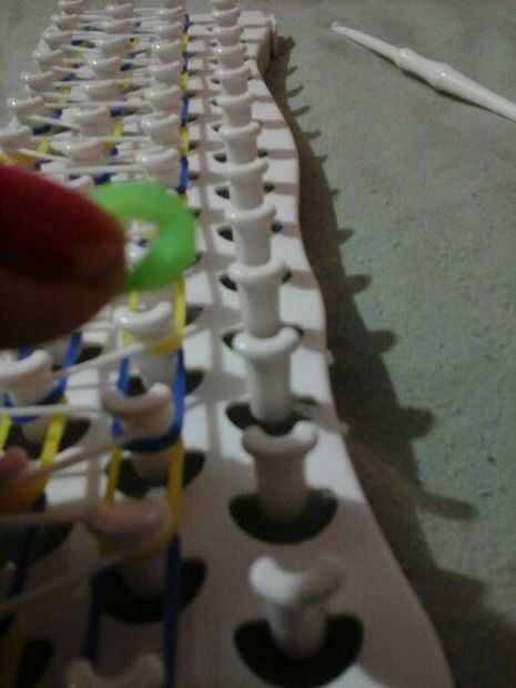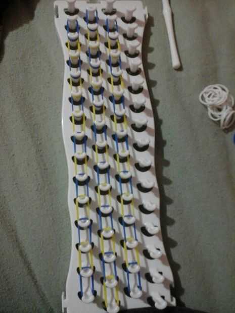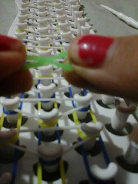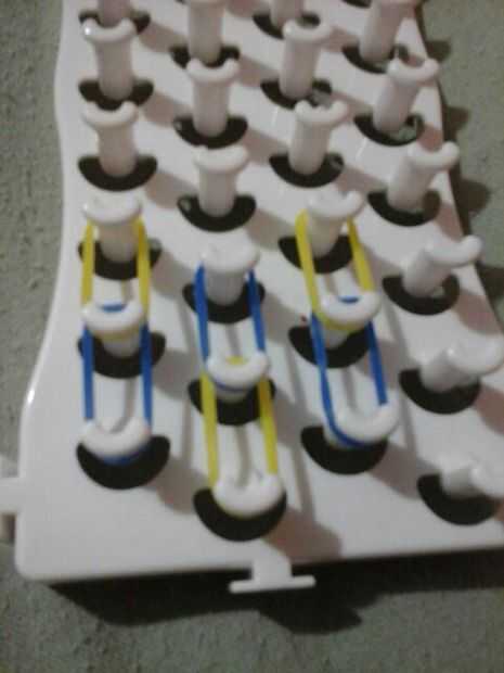 aquí hay un tutorial de una pulsera única triple.Paso 1: materiales Necesita 3 bandas de colores diferentes, su telar y su gancho.Paso 2: Poner las bandas en This step is easy! Simplemente poner las bandas en una fila y al revés por triángulos.Paso 3