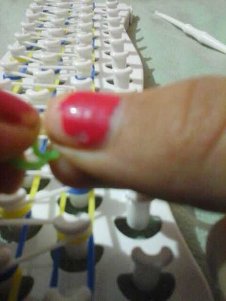 Paso 1: Comenzar la pulsera Primero usted tiene que asegurarse de que las flechas de su telar son hacia arriba y poner las bandas en el lado derecho hacia arriba y hacerlo hasta que la izquierda derecha y centro se llenan de bandas. Pero no las clavi