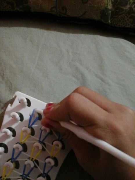aquí hay un tutorial de una pulsera única triple.Paso 1: materiales Necesita 3 bandas de colores diferentes, su telar y su gancho.Paso 2: Poner las bandas en This step is easy! Simplemente poner las bandas en una fila y al revés por triángulos.Paso 3