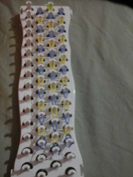Paso 1: Comenzar la pulsera Primero usted tiene que asegurarse de que las flechas de su telar son hacia arriba y poner las bandas en el lado derecho hacia arriba y hacerlo hasta que la izquierda derecha y centro se llenan de bandas. Pero no las clavi