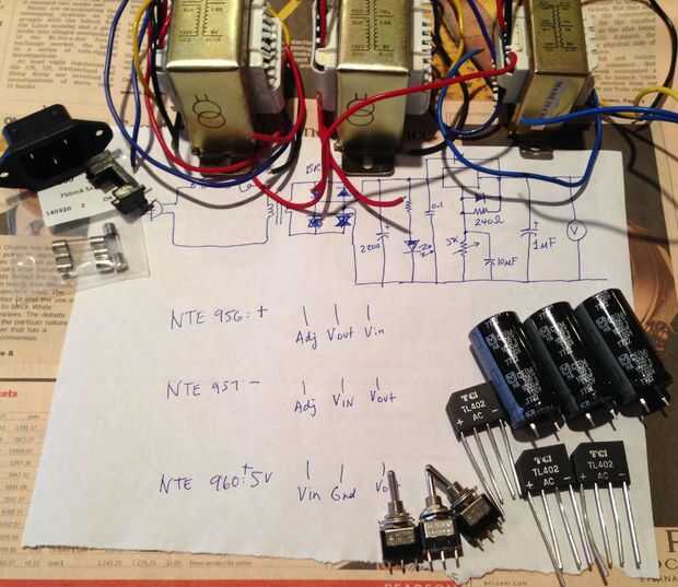 Misc.: postes, tornillos, aislantes que vinieron con los reguladores de voltaje, perillas de dos potenciómetros, 750mA fusible y titular, IEC-C14 enchufe y cable de alimentación, cable de conexión, epoxi, fieltros para el fondo de la caja, herramientas para perforación y corte, etc..