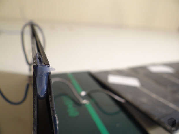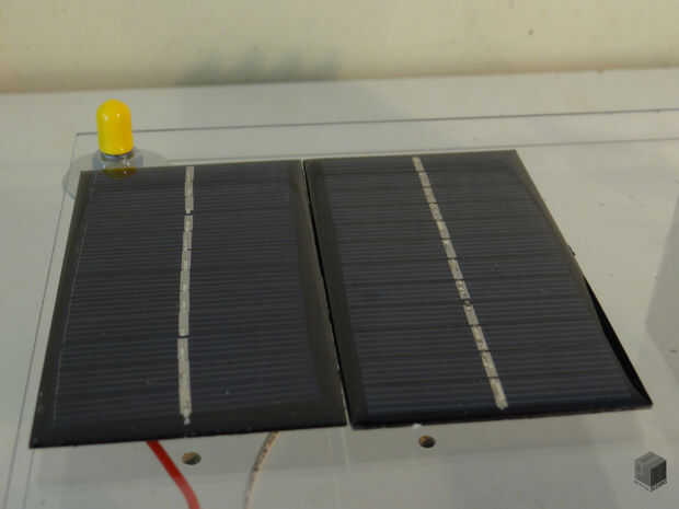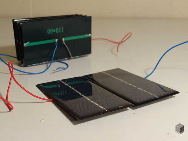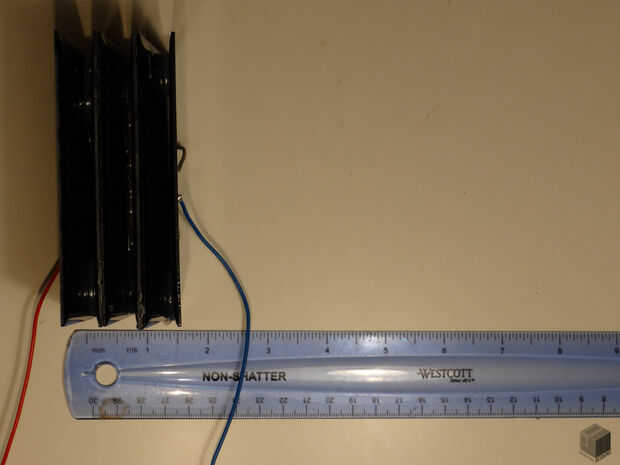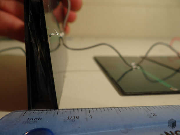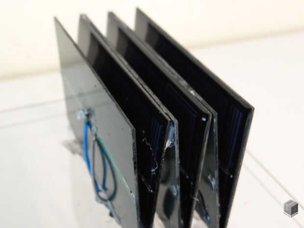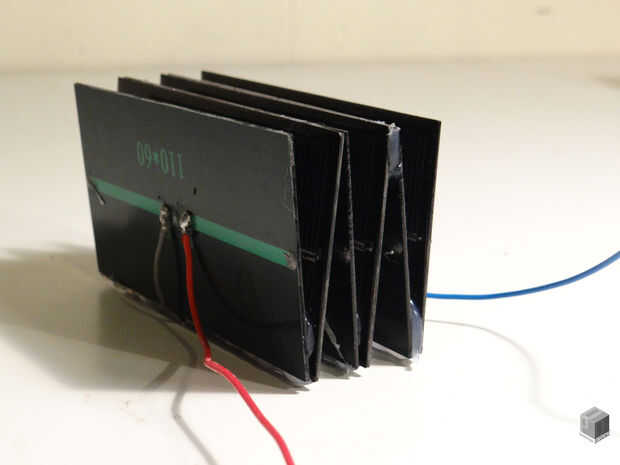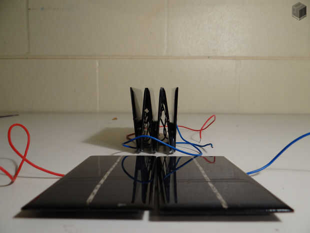 A continuación, vamos a producir la matriz experimental. Esto puede ser construido según las especificaciones de mi o ajustado según su criterio. Dispone de un conjunto de seis celdas por cable, ataremos a uno a la vez con pegamento. Se asociará a nuestras células en forma de "V" con un ángulo medido de 22.5°, que se traduce en una brecha en el extremo abierto de 0.5 pulgadas para cada par. Esto puede calcularse fácilmente por las células de una dimensión diferente. Cada "V" debe tener las células solares mirando hacia el interior. Ahora ataremos las tres parejas con pegamento que una anchura total de sólo alrededor de 1,5 pulgadas, como se muestra.