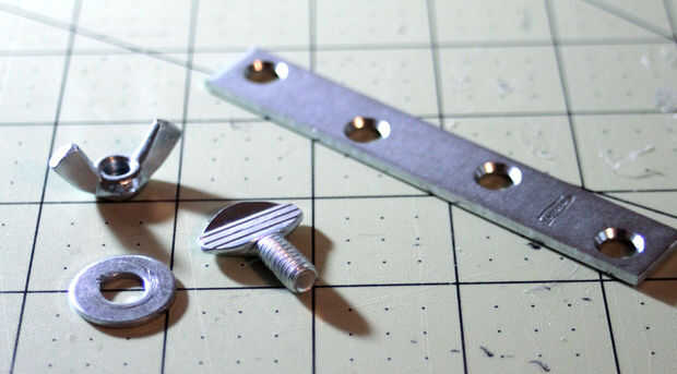 Un tornillo de pulgar de 1/4-20 x 1/2". No dejes que los números le ahuyentar. 1/4 se refiere al diámetro del perno. 20 es cómo muchos hilos del perno tiene por pulgada y 1/2" es la longitud del perno desde el principio hasta el final del hilo. Tornillo de mariposa sólo se refiere al tipo de cabeza. Originalmente, usé un maleficio 2" con el mismo roscar tuercas como espaciadores, pero finalmente se rompió y compró el tornillo de 5 céntimos de Menard porque era más fácil de usar que un perno hexagonal. Pero un tornillo hexagonal, o casi cualquier tornillo excepto tal vez un perno de carruaje, funciona.