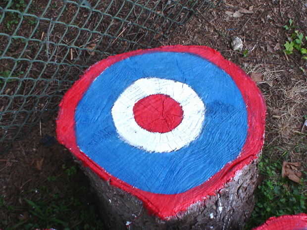 Elegir la mejor "cara" para el destino de la ronda. Asegúrese de limpiar con un cepillo de alambre para quitar cualquier suciedad y aserrín. Puntuación de una cara de destino triple ojo de buey. Uso un ojo de buey de diámetro 4 pulgadas, un anillo interno de 8 pulgadas de diámetro y un anillo exterior de 16 pulgadas de diámetro. Pintura rojo ojo de buey (pinté el exterior, no puntuación son rojos también). Pintar el aro interior blanco, pintar el aro exterior azul. Que cada uno color seco completamente (24 horas para cada color) antes de aplicar el siguiente color, así que no sangran y mezclar con los demás.