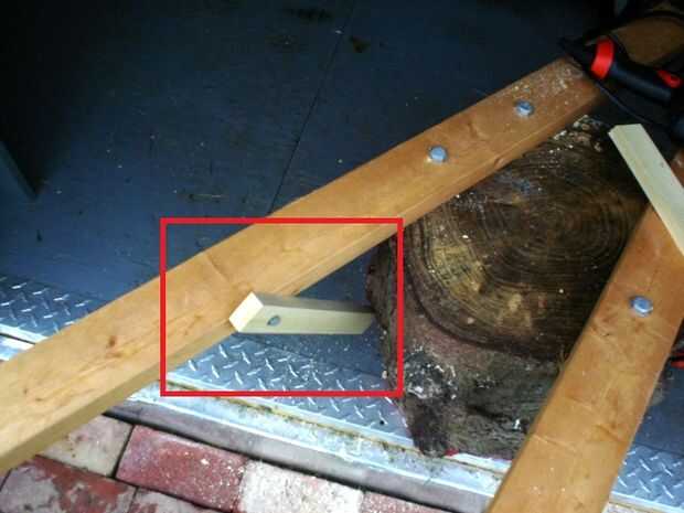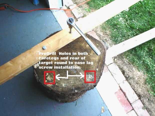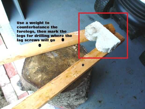 Una vez que ambas patas delanteras son seguras, cortar el bajo soportes redondos en piezas largas de 1 pie, Pretaladre para ¼" tirafondos y fije al interior de cada pata delantera como se muestra en la imagen.