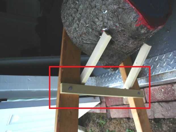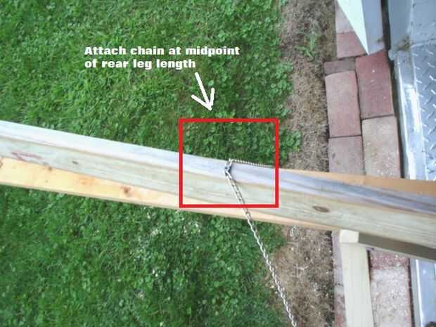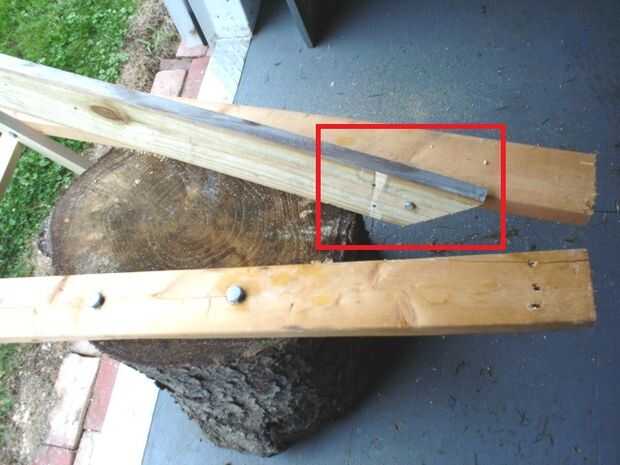Cortar la parte superior de la pata trasera de manera que su borde hacia adelante coincide con el ángulo frontal de una de las patas delanteras. Perfore previamente ambos él y una pata delantera y fije la pata trasera a ese pata con un tornillo de lag ¼".