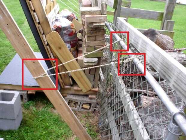 La intención de la cadena es que la pata trasera del trípode / caballete más de extensión hacia atrás. Para ello, establecer la unidad en las patas delanteras, permitiendo que la pata trasera para posicionarse para que la cara de la blanco redondeada es aproximadamente perpendicular al suelo. Extienden a cada lado de la cadena hacia delante, a fijarlo en el centro de la parte exterior de cada pata con un tornillo para madera. En el caso de muestro, la Ronda es muy pesado (sobre 87 lb – 39,5 Kg) - así que tuve que revertir esto y conecte la cadena a una estaca superior detrás de él para guardarlo de caer hacia adelante y también necesaria para apoyar las patas delanteras en bloques de concreto (paso opcional).