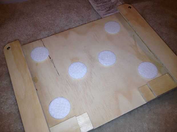 Cortar una placa de base 30 cm x 21 cm, cortar 4 trozos de tiras de madera de 21 cm x 2,5 cm (2 adicionales que si usted desea utilizar con un ipad en el caso - esto es lo que hice) y 2 o 3 piezas de franjas de madera de 25 cm x 2,5 cm (estas son las bandas para sujetar el ipad en la parte inferior se pueden utilizar más cortos para mejor ventilación) y 2 piezas de 21 cm x 4 cm (estas 2 piezas mantenga el ipad en su lugar).