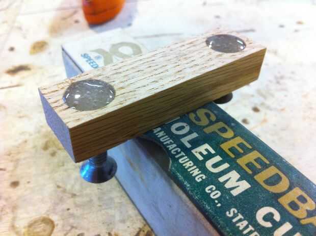 Soltar la tuerca en el agujero y rosca un tornillo de repuesto 1/4" de la parte inferior quede al ras con la parte superior de la tuerca del extremo del perno. Tensar la tuerca contra el fondo del agujero y vierta el epoxi en la parte superior. Cuando el epoxi se ha secado, retire el perno y arena cualquier sobresaliente de epoxy al ras con la madera.