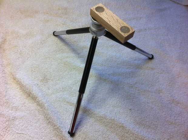 Medir la distancia entre el centro del iPhone y la lente, y cortar un pedazo pequeño de madera acomodar dos agujeros de esta distancia. Para mi iPhone 4, coloqué los soportes aproximadamente 1 7/8" aparte, y mi pieza de madera es de aproximadamente 2 5/8" largo, 3/4" ancho y alto de 3/8".
