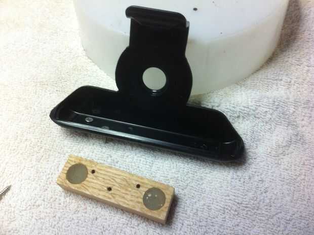 El último paso es colocar la pistolera de cadera modificada a la pieza de madera. Después de alinear los puntos de montaje con la lente y el centro del iPhone, usé tres tornillos pequeños para madera, perfore agujeros guía y avellanado en la funda.