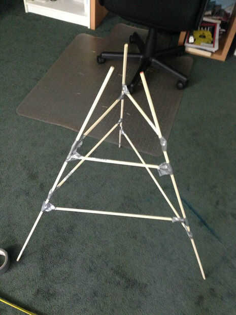 Una vez más, unir las piernas como antes, con vigas horizontales pegadas a cada pata. Cada viga será necesariamente ser escalonada por encima o por debajo del justo al lado de él, ya que hace más fácil grabar.