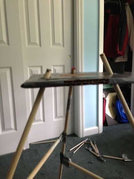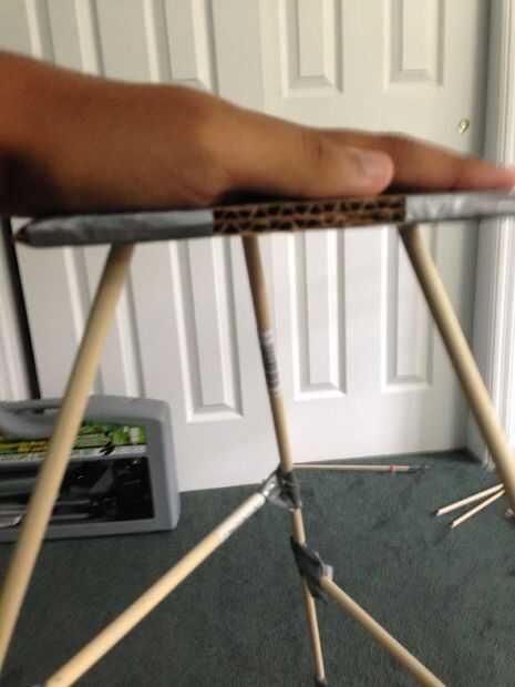 Colocar en la parte superior del trípode y marcar donde quieres poner los agujeros en la base. Entonces, utilizando cualquier objeto punto (yo usé las tijeras), ponen en los agujeros.
