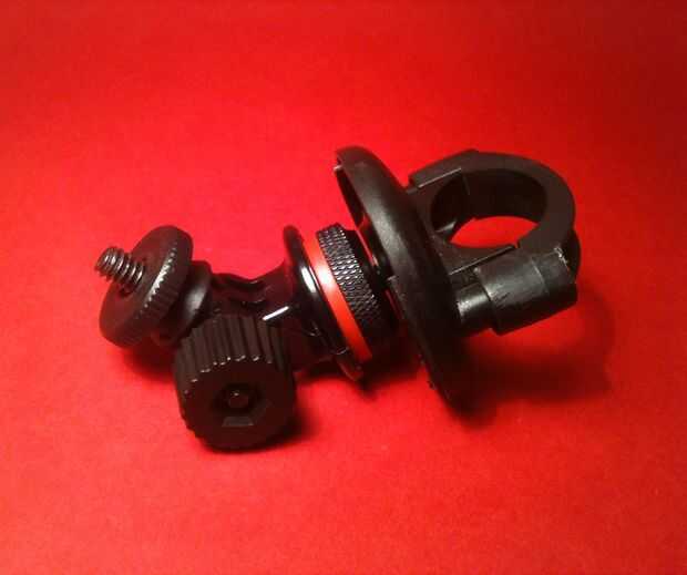 Simplemente bajo la campana de la bici manteniendo sólo la base plana (foto #4), taladré un agujero en el centro y luego inserté el corte tornillo de 1/4 '', su par de tuercas, una Junta de goma (tomada de una cerveza) para llenar la brecha y finalmente el trípode de montaje adaptador y el adaptador de montaje universal 1/4" mini trípode.