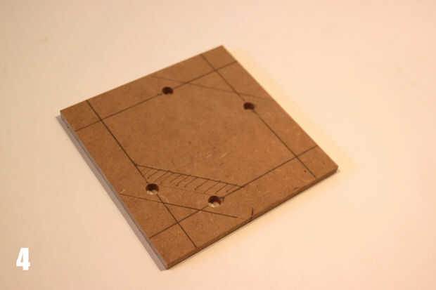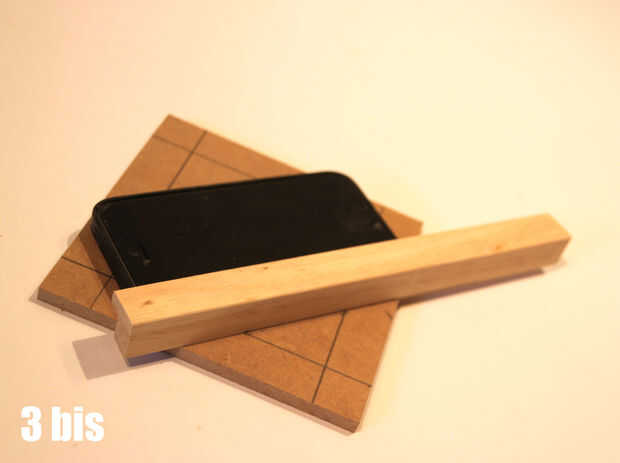 • Hacer una pieza cuadrada de MDF (130 mm 130 mm). Poner marcas de 20 mm de los bordes (Foto 3). Mida el ancho del teléfono y marque donde los bordes son (bis foto 3).