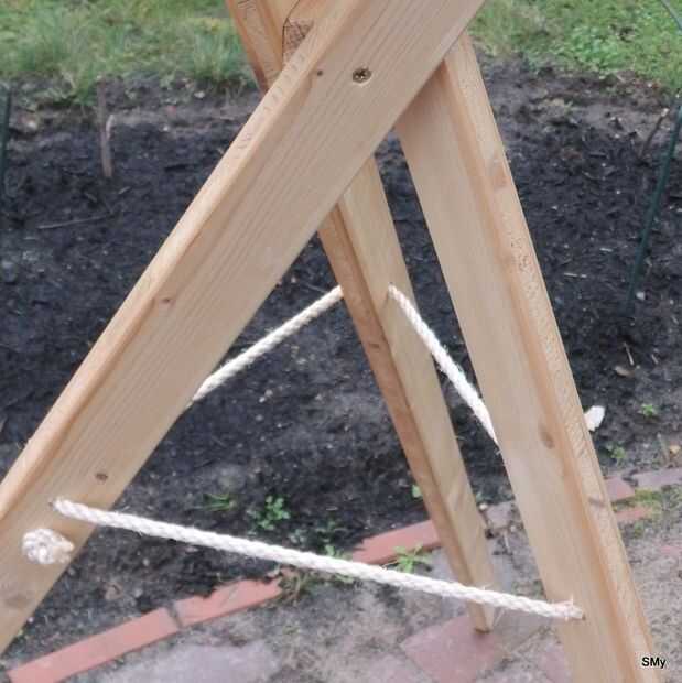 Tener un buen soporte para todo lo que va a colocarse en este trípode y para prevenirlo haciendo las fracturas tenemos un tope. Encontré cierta cuerda en mi caja de piezas de repuesto y perforar cuatro agujeros, de unos 30 cm por debajo de la centralpiece, simplemente ajuste la cuerda (aquí: 6 mm). Simples nudos en los extremos darán una estabilidad suficiente.