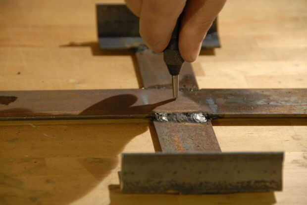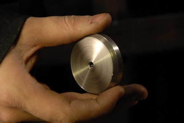 Este paso implica el taladrado y roscado 1/4"- 20 rosca en el centro de la bandeja que sólo soldados. Este es el paso donde usando el acero del resorte es desventajosa. Si no tienes un taladro que puede definir la velocidad adecuada en, es fácil de trabajar endurecen y rotura de brocas en. Terminé de encender un enchufe de un torno ya que era más simple que el recocido el acero después de que endurezca.