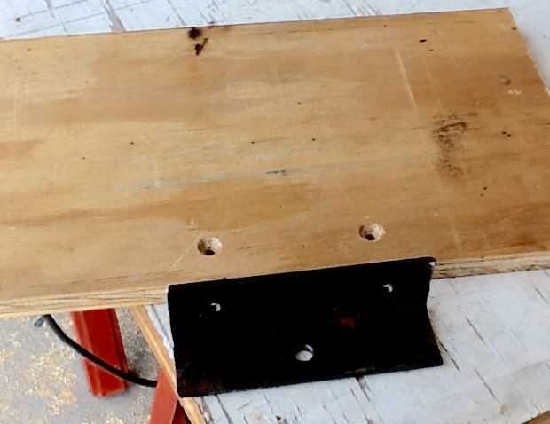 He marcado los dos agujeros más pequeños en el ángulo de hierro sobre la madera contrachapada y perforado. Avellane los agujeros para tornillos de cabeza biselados. Ver la foto.