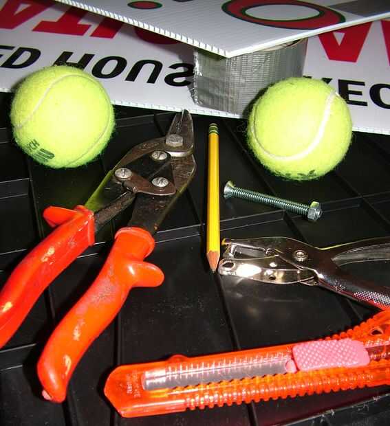 Excepto los tornillos y cinta adhesiva, la mayoría del trípode se hace de reciclado de viejas muestras y pelotas muertas (gratis en cualquier cancha de tenis).