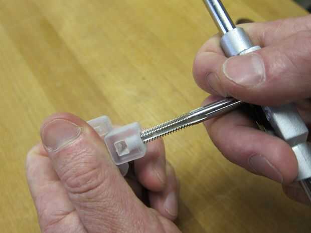 Si has aprovechado agujeros antes, este es un juego de niños. Si no, Compruebe hacia fuera este Instructable — no necesita cualquier fluido de corte ya que es impresión 3D en algún tipo de plástico o resina. El proceso de tapping es súper rápido y puede hacerse en la mano.