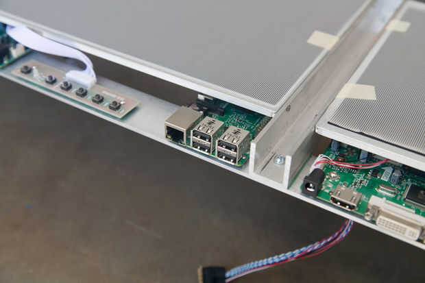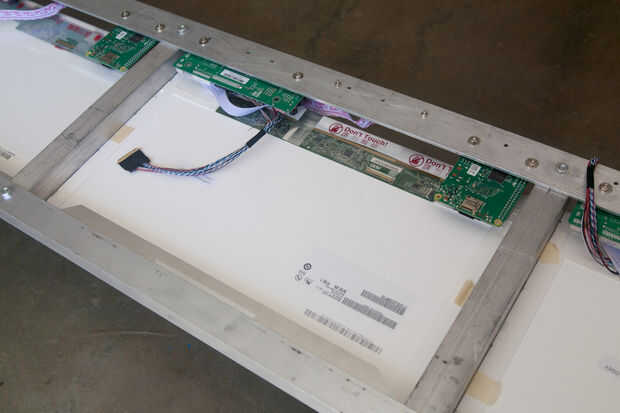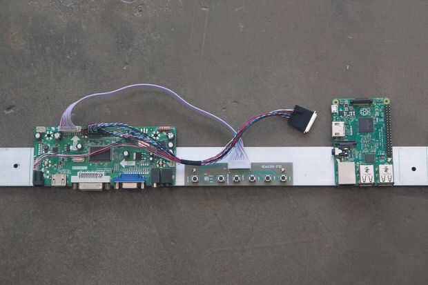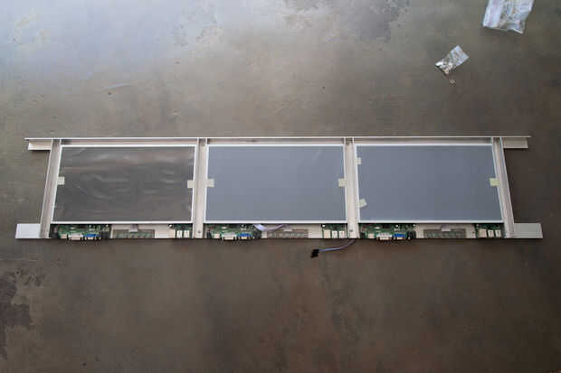 La primera orden del día fue crear un marco de aluminio para montar las pantallas. Tengo unas barras de aluminio estándar de The home depot y había cortado a la medida. He perforado unos agujeros pequeños en los montantes de aluminio vertical y montadas las pantallas utilizando los pequeños orificios a lo largo de sus bordes que están diseñados para que puedan montarse en el portátil. A continuación, cortar dos puntales horizontales que atornillada a los postes verticales a y terminó con un bonito marco robusto que las pantallas eran bien montadas a. De la costilla superior, utilicé una pieza de ángulo y de la costilla inferior, utilicé una pieza de plat que era suficientemente ancha como para montar los componentes electrónicos. Unos agujeros y 18 pequeños pernos, tuercas y tornillos más adelante más adelante, la electrónica estaba en! Le enchufamos todo y todo enciende bien...