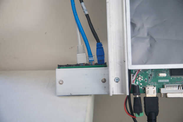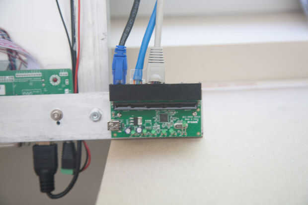 El siguiente orden del día fue averiguar cómo conseguir las máquinas que hablan entre sí. La frambuesa A que PI viene con un conjunto de GPIO que puede ser conectado junto dispara hacia adelante y hacia atrás, pero que estaría un poco limitada. También, puesto que rápidamente me di cuenta de que necesitaría ethernet entrar y personalizar el sistema operativo de raspbian en cada máquina individual, decidí utilizar OSC para desencadenar todos los eventos necesarios sobre TCP/IP. Me consiguió un pequeño hub USB, fuerza abrir la caja de plástico barata, liberado el pequeño circuito electrónico alojado en ella y procedió a montarlo en el marco de la misma. Conectar cables de ethernet entre el cubo y las tres máquinas y también conectar el hub a mi router de casa que me permitió conectar y configurar las tartas de frambuesa de mi portátil.