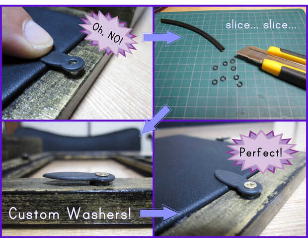 Podrían comprar las arandelas (si encuentras algo de color y de tamaño adecuado), pero tenía un viejo pedazo de tubo negro rígido que coincidió perfectamente con las lengüetas de plástico negro. Corte cuidadoso solucionó el problema en cuestión de minutos.