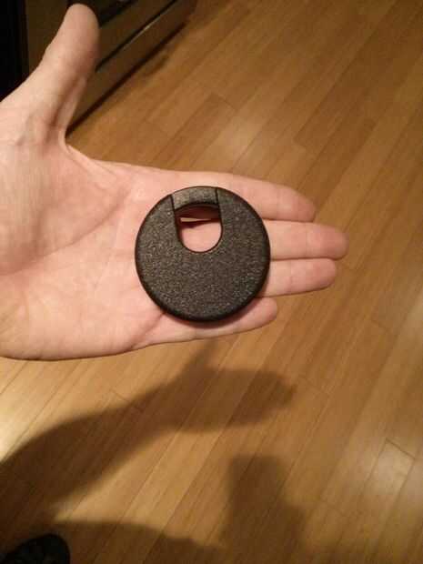 A continuación, perfore el orificio por donde sale el cable de alimentación el caso. Decidí usar un ojal de plástico para hacer el agujero un poco más ordenado, pero no es necesario. Este ojal requiere un agujero de 2". Para ello, utilicé una sierra del agujero. Taladré un agujero guía con una broca normal, entonces empecé con la sierra. Si usted perforar sobre a mitad de camino, luego dé vuelta el caso y continuar la perforación desde el exterior. Esto asegurará un agujero limpio agradable en ambos lados. En este punto fue donde me di cuenta de que era la arandela de 3/8" demasiado profundo para el caso. Me corte el exceso con una segueta y había retocado con papel de lija. Entonces usé silicona para asegurar el manguito en su lugar. Con el agujero perforado, entonces pude Atornille las tiras de velcro en el lugar que se mantenga la barra de energía.