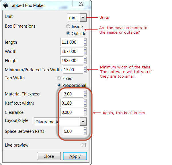 Para conseguir un buen ajuste sólido con estos tipos de cajas, es importante saber el corte de la cortadora láser. Corte es la anchura del material que es quitado por la herramienta - que el grosor de la línea. Es importante saber el corte al construir estas cajas con fichas. Si las piezas son un poco flojas, la estructura no será sólida. El fabricante de la caja de fichas tiene esto en cuenta al colocar las cajas. James en RedToRope tiene una buena explicación y maneras de medirla. O la forma rápida (menos precisa) es usar esta tabla sobre en CLC para una guía preliminar para ponerte en marcha.