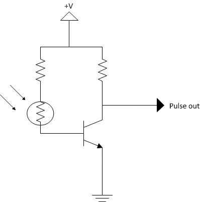 La primera imagen muestra el Detector de luz. Cuando la luz (o un láser) brilla sobre el fotoresistor el fotorresistor permite actual pasar. Puesto que queremos que envíe un pulso cuando no hay luz (o cuando el rayo láser se rompe) corremos un inversor o puerta no. Esto hace que cuando la luz está brillando no hay ninguna salida de corriente, pero cuando no hay luz no hay corriente que fluye a través de la salida.
