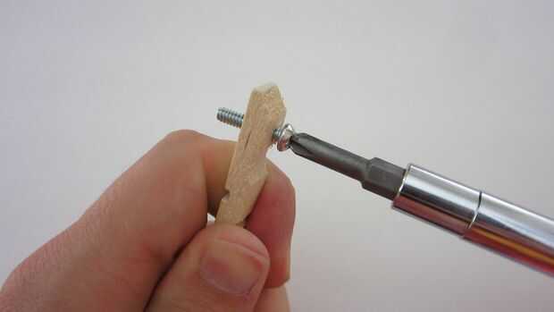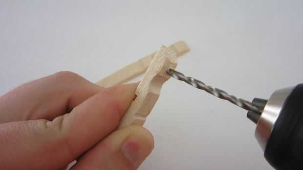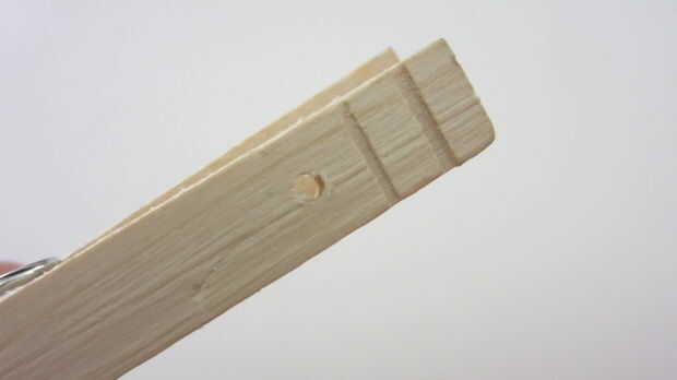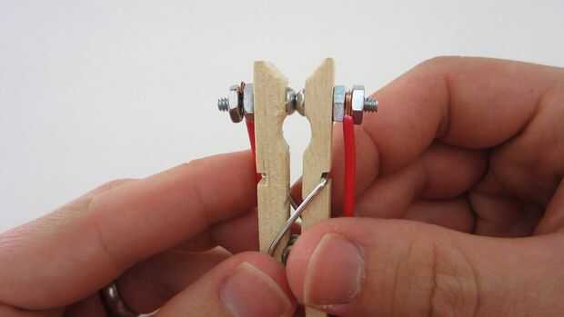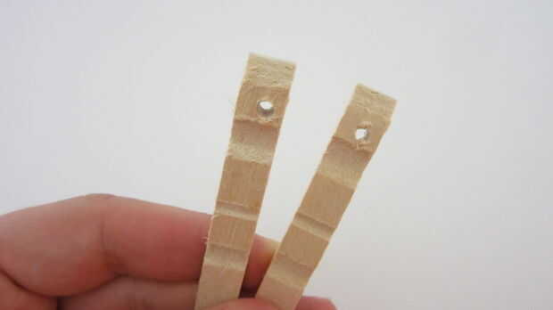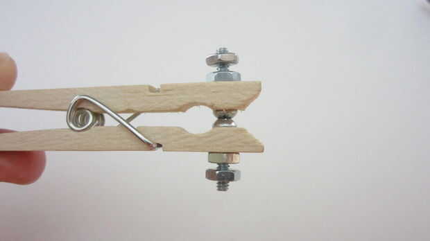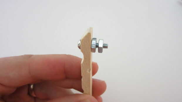 Empezar por desmontar la pinza para la ropa. Luego perfore un agujero en el extremo de ambas piezas de madera que es el mismo diámetro que el tornillos de máquina. Inserte los tornillos a través de cada agujero con la cabeza de los tornillos en el interior de la pinza para la ropa. Apriete la tuerca en la parte posterior de cada pieza de madera para asegurarla en su lugar. Añadir a continuación una segunda tuerca en cada tornillo. Esto se utilizará para conectar los cables del transmisor. También puede perforar un pequeño agujero en el extremo opuesto de cada pieza para conectar una línea al colgar el tripwire. Una vez que haya terminado de modificar dos pedazos de madera, volver a montar la pinza de ropa.