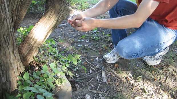 Corte la segunda pieza de la línea que es tiempo suficiente para cruzar la vía. Añadir un pequeño sobrante para los nudos que necesitas hacer asegurarlo en su lugar. Atar un extremo a algo en el lado opuesto de la ruta de la primera pieza. Luego tomar el extremo libre la pinza.