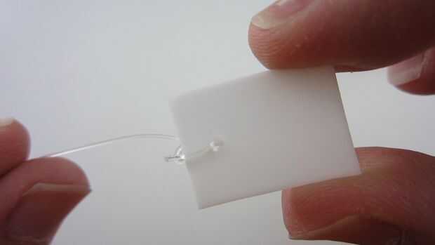 Primer corte de un pedazo corto de línea que apoyará el transmisor. Atar un extremo con el agujero en la parte posterior de la pinza para la ropa. Luego atar el otro extremo a algún accesorio que está cerca de la vía.