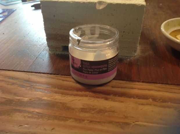 * Otra vez, realmente necesitas gafas para este part.* este es el paso más difícil para mí y no he dominado todavía. Es esencial tener una una pasta fundente. Flujo útil es lo que mayoría de la gente utiliza para soldadura de plata. Sólo pude encontrar la pasta de flux en el cuadro de Miguel y funcionó bien. Inicialmente utilicé un flujo usado para tubos y quemado demasiado rápido antes de que podría derretir la soldadura. Era muy liberal en el flujo de la pintura y lo pongo en ambas piezas. El flujo ayuda a absorber el oxígeno por lo que al calentarlo, escala no impide que la soldadura fluya. La soldadura es una soldadura de plata mediana. Soldadura de plata viene en fácil, medio y y duro. La fácil se funde a una temperatura más baja. y diferentes tipos de soldadura se utilizan para evitar que una soldadura de fusión cuando se agrega un nuevo soldado pieza. Afortunadamente, sólo necesita un único tipo para este proyecto. Cortar la soldadura de plata en pequeños cuadritos con el hojalatero, pero tijeras trabajaría demasiado.