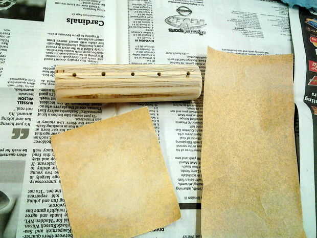 Una vez que tenemos nuestra forma de cilindro de la manija, luego necesitamos perforar los agujeros para insertar los pedazos de nuestros pinchos de metal en (desde el paso anterior). Utilicé un trozo de madera y taladrar orificios con brocas progresivamente más grandes hasta que conseguí un agujero lo suficientemente grande para los pinchos de metal deslizarse cómodamente en. Lo hice antes de taladrar los agujeros en el mango.
