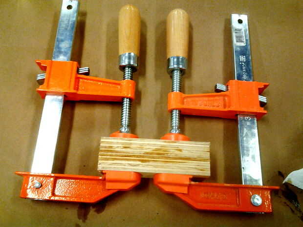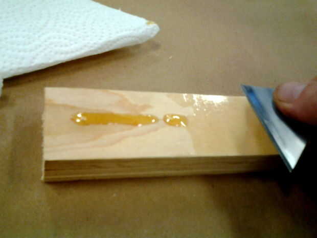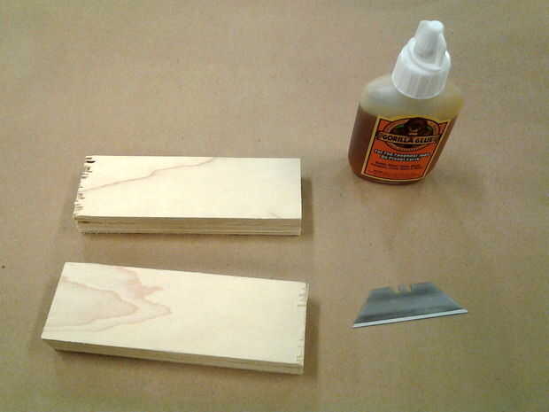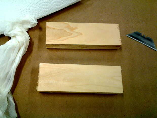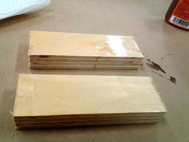 A continuación usted sólo pone un poco poco de pegamento en cada una de las superficies y extendió con algo. Utilicé una hoja de afeitar en esta instancia. Entonces es hora para la sujeción. Quiero configurar mi madera piezas que soy gorila pegado a un lado para curar durante la noche. 12 horas debería ser suficiente.