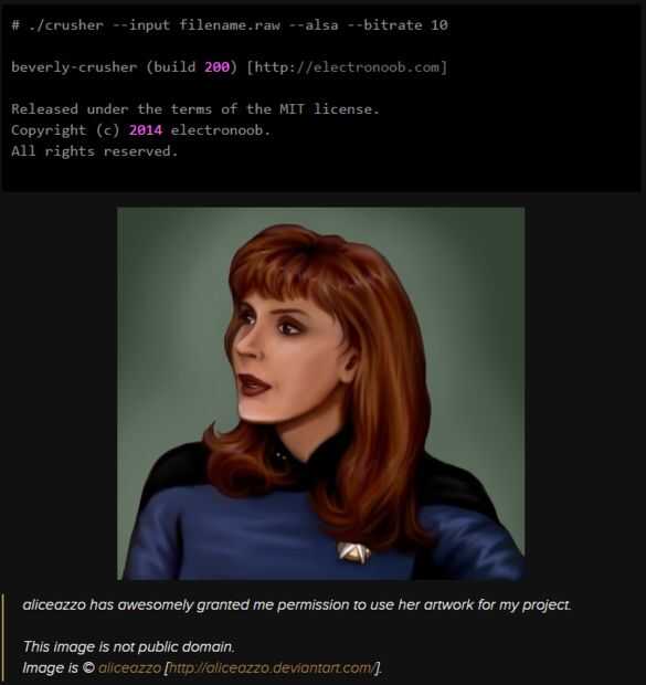 Aquí estoy ofreciendo un programa de trituración audio que también exporta a arduino sketch extremadamente fácil para que uno pueda experimentar con audio de 1-bit y manipular las tasas de muestra rápidamente. El github tiene fuente a la trituradora que compila bajo Linux y puede permitirle escuchar el audio comprimido a través de ALSA antes de generar el sketch de Arduino. La matriz de las muestras que se genera puede ser utilizada en otros proyectos embebidos sin ser específicamente un arduino pero usted tendrá que modificar el código de reproducción según corresponda.