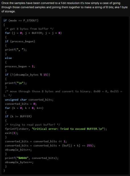 Una vez que las muestras han sido convertidas a una resolución de 1-bit ahora es simplemente un caso de ir a través de estas muestras se puede convertir y unirlas para formar una cadena de 8 bits; también conocido como 1 byte de almacenamiento.