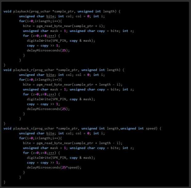 int z;for (z = 0; z < 4; z++){ playback(onebitraw_1, BC_BYTE_COUNT_1 /4); playback(onebitraw_2 + (BC_BYTE_COUNT_1 /4), BC_BYTE_COUNT_1 /4); playback_r(onebitraw_3 + (BC_BYTE_COUNT_1 /2), BC_BYTE_COUNT_1 /4); playback(onebitraw_2 + ((BC_BYTE_COUNT_1 /4) + (BC_BYTE_COUNT_1 /2)) , BC_BYTE_COUNT_1 /4); } Si se rompe hacia abajo lo que hice se convierte en muy fácil de entender... Imaginar que estas cartas representan los 4 diferentes patrones de ritmo que creé en razón antes de importar en mi Arduino.