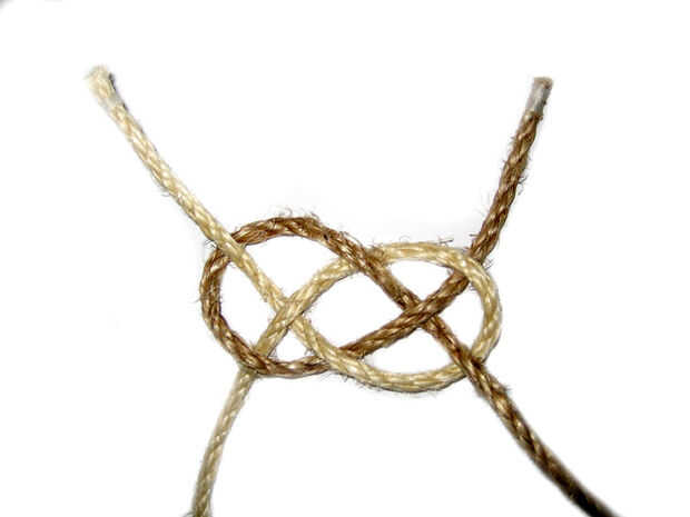 En realidad, si usted está interesado en los detalles, la verdadera Carrick bend es totalmente entrelazada (lo que significa que las líneas alternan sobre y bajo en cada cruce) como la nuestra pero también diagonalmente opuesto, que significa que los dos extremos sale en los lados opuestos del nudo. Esta variación, según Wikipedia, se conoce como el Josephine Knot en macramé, el nudo de doble moneda de anudar chino y el nudo de la raíz en Armería. Te dije que era popular.