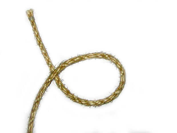 Para empezar, tome la primera cuerda (estoy usando dos cuerdas con diferentes colores en las imágenes de abajo) y doblar un extremo en sí mismo. Esto es llamado una Bahía. Realmente queremos un cruce gire, tan tuck final debajo de sí mismo como se muestra en la segunda imagen de abajo.