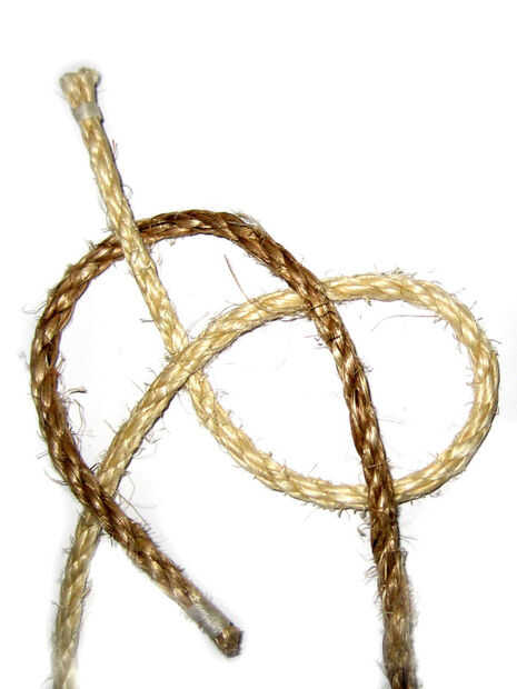 A continuación, coloque el extremo de la segunda cuerda por encima de la su travesía entretejido debajo y sobre los dos extremos sobresalen (llamado técnicamente el trabajo final y la parte derecha) y gire como en la tercera imagen.